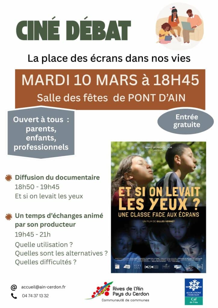 Parents, enfants et professionnels sont invités mardi 10 mars à 18h45 à la salle des fêtes de Pont-d’Ain pour la projection du documentaire “Et si on levait les yeux ? Une classe face aux écrans”, suivie d’un temps d’échanges animé par son producteur autour de nos usages numériques, des difficultés rencontrées et des alternatives possibles.